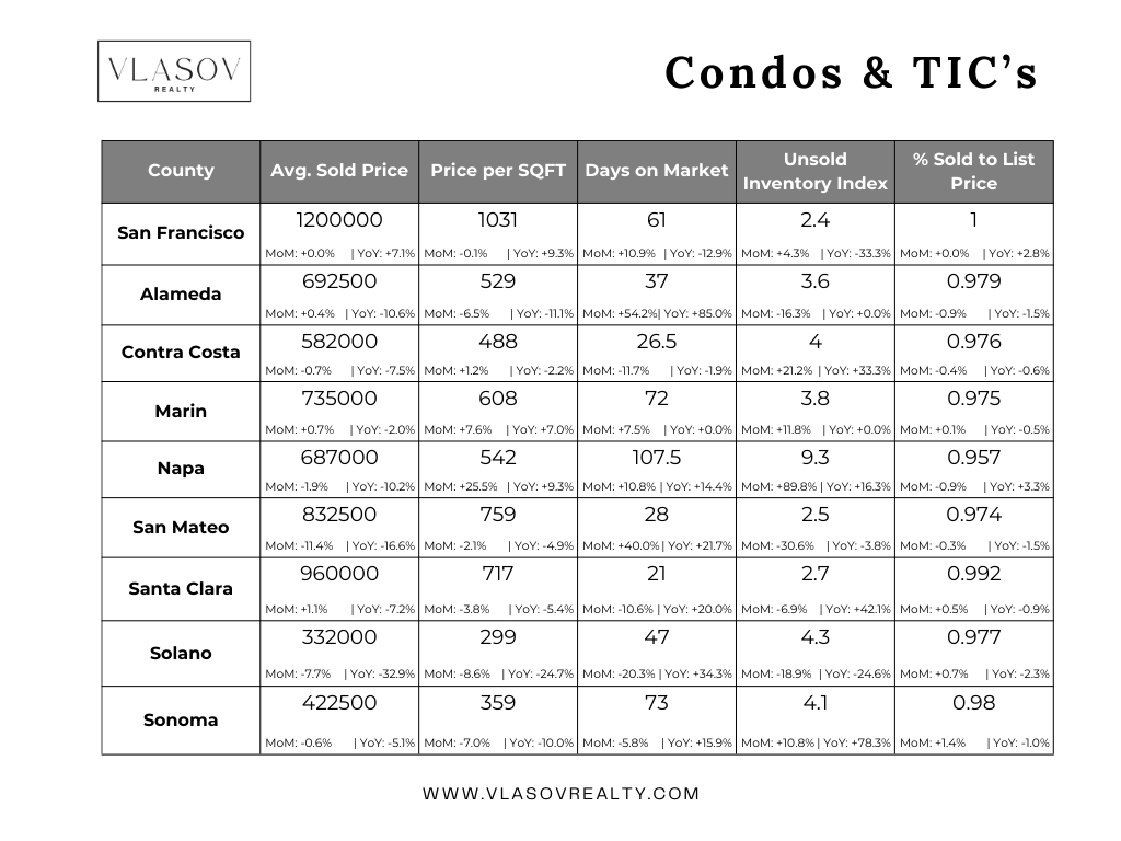 In San Francisco, the median condo price has risen to approximately $1.2 million, an increase of over 7% year-over-year. While sales dropped by nearly 30% from October, they remain slightly higher than last year. The price per square foot is around $ 1,031. Inventory levels are approximately 2.4 months, and condos stay on the market for about sixty‑one days. The return of tech workers to offices and the increased vibrancy of cities have revitalized the condo market. Units in desirable buildings tend to sell at or above the asking price, while an abundance of older, less updated condos presents value opportunities. Marin and Napa also enjoy strong markets. Marin’s median condo price is about $735 , and Napa’s is roughly $ 687,000, both experiencing double‑digit gains compared to last year. Inventory is higher here, around 3.8 months in Marin and close to 9 in Napa, giving buyers plenty of options, though the average time on market exceeds 2 months. In Santa Clara and Alameda, condo prices have decreased. Santa Clara’s median price of approximately $ 960,000 has fallen 7% from last year. Alameda’s median of about $ 692,500 is over 10% lower. Inventory ranges from about 2.7 to 3.6 months, with condos spending between 21 and 37 days on the market. Buyers have more negotiating power, and many sellers are offering concessions. Contra Costa, Solano, and Sonoma have more affordable condos. Contra Costa’s median price is about $582, with about 4 months of inventory and condos averaging about 27 days on the market. Solano’s median is approximately $332 , with about 4.3 months of inventory and condos staying around 47 days. In Sonoma, the median price is $422 , with similar inventory levels and nearly 73 days on the market. These markets offer entry‑level options but can be volatile month‑to‑month, so patience is key.