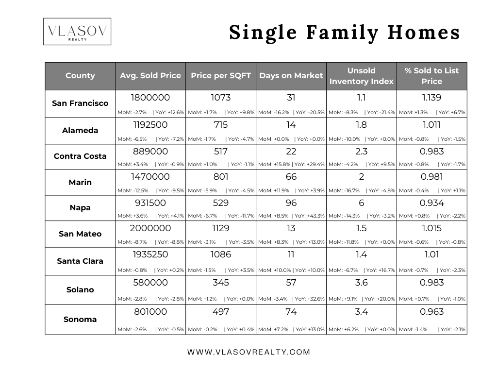 Single-family homes (SFH). In November 2025, the median price for single-family homes in the Bay Area was approximately $1.275 million, representing a decline of about 2% from October and 3% from the previous year. Sales decreased by roughly 22% month-over-month and 3% year-over-year. The average price per square foot was $725, slightly lower than in October. Homes generally sold for their asking prices, and the region's inventory stood at around 2.2 months. The median time on the market was twenty-five days, longer than last winter but still relatively brisk.